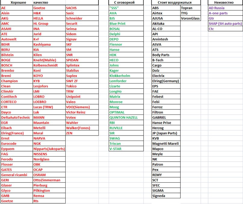 В целом из каждого правила бывают исключения, так и по вышеприведенным организациям бывают приятные и неприятные инциденты. Например, под одной и той же маркой могут продавать отличные сайлентблоки и отвратительные прокладки двигателя. Но в целом тенденция такая, как приведена выше.